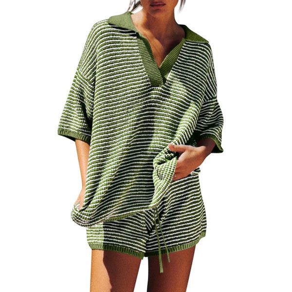 Tankaneo Womens Sweater Set 2 Piece Outfits Oversized 3/4 Sleeve V Neck Knit Tops High Waisted Shorts Lounge Sets