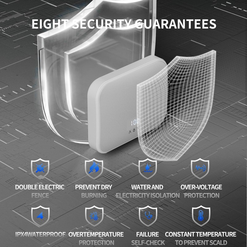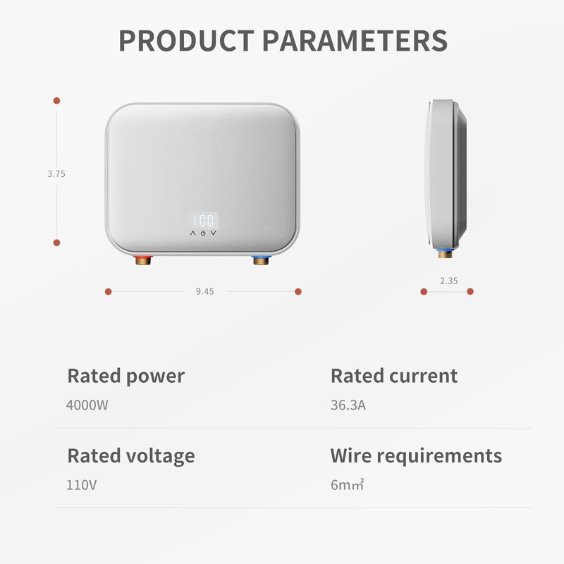 - Safe Zone Design - This water heater adopts an integrated cast aluminum heating design inside, completely separating the electrical system and fluid system to prevent leakage and water pipe corrosion, while greatly improving safety. With powerful features such as dual electric walls, anti dry burning, overvoltage protection, grounding protection, constant temperature and anti scalding, IPX4 waterproof, and over temperature protection, you can rest assured that you can supply safe hot water on demand.
