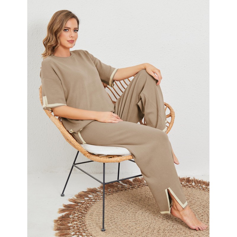 - Knit lounge set pant set for women to wear around the house as pajamas loungewear, or outside on street, shopping, travel as knit sweatsuit. Can be worn as a set, or as separates, effortless cozy and chic designs for a laidback, throw-on-and-go approach to dressing