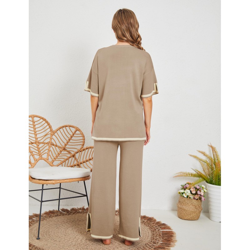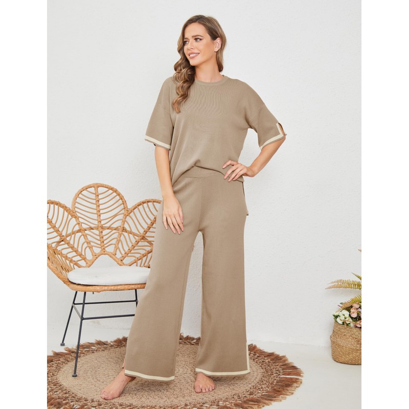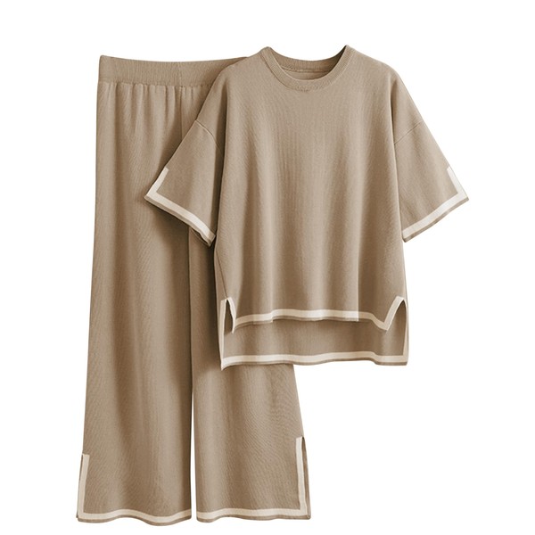 Tanming Sweater Sets Women 2 Piece Lounge Sets Short Sleeve Knit Pullover Tops Wide Leg Pants (DarkKhaki-XL)