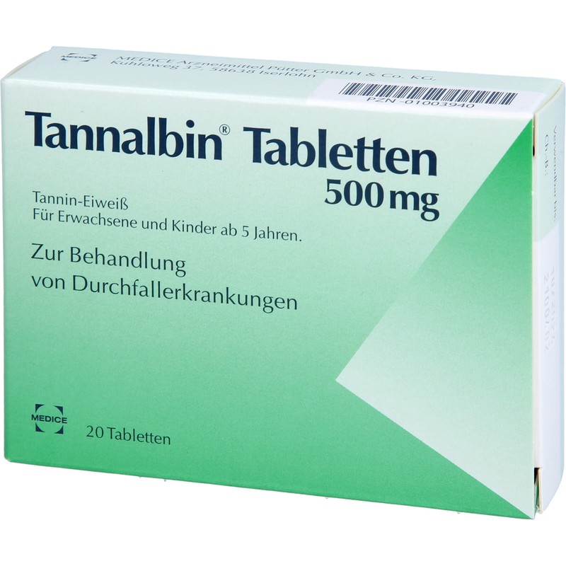Tannalbin Tabletten 500 mg. Wirkstoff: Tannin-Eiweiß. Anwendungsgebiete: Unterstützende Behandlung bei akuten unspezifischen Durchfallerkrankungen, wie z. B. Sommer- und Reisedurchfälle. Für Erwachsene und Kinder ab 5 Jahren.