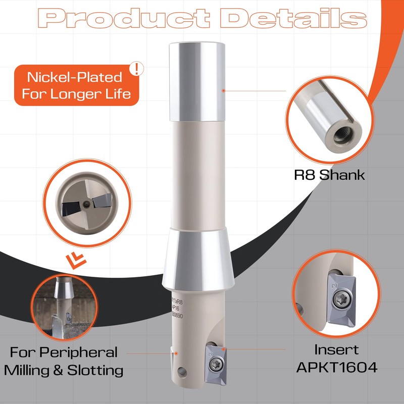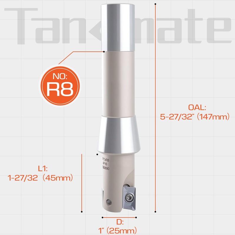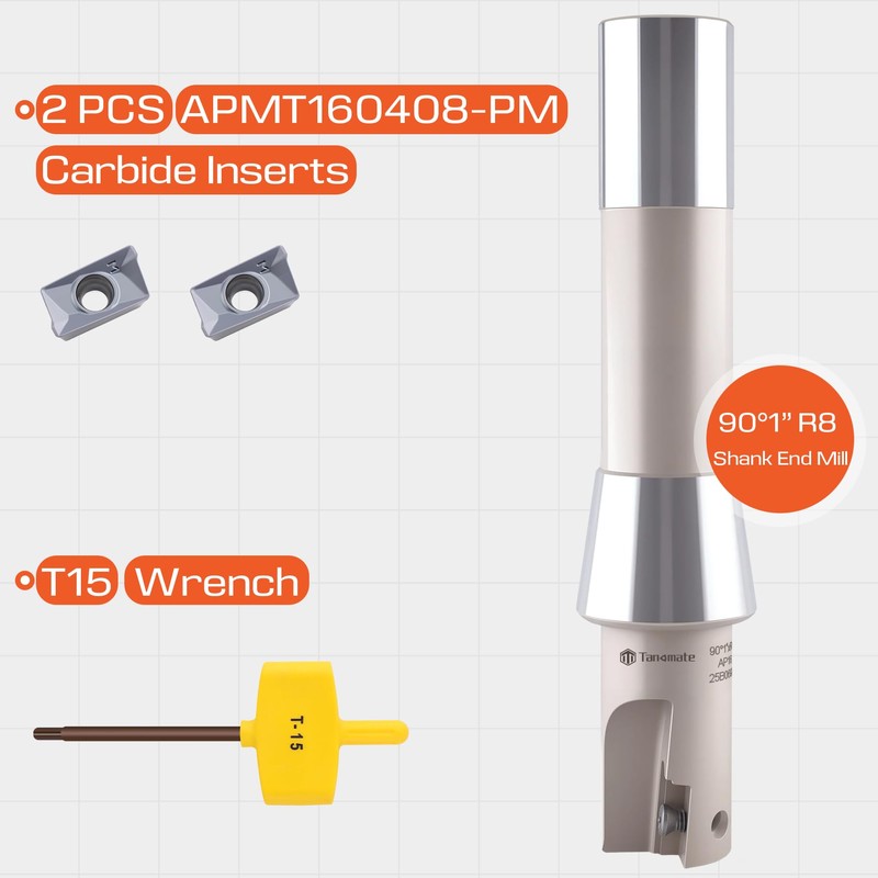 • Pre-installed with 2 coated APKT1604 indexable carbide inserts for improved cutting efficiency and extended tool life, enabling high-speed, high-performance machining with R8 indexable end mills.