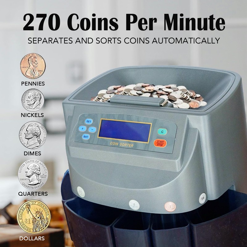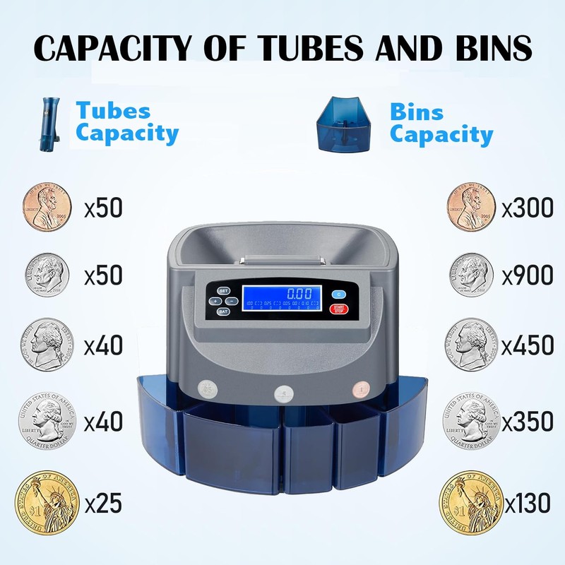 - High-Capacity Tubes & Decent Sorting Speed: Features large tubes and processes up to 270 coins per minute. No more manual counting—ideal for busy businesses, charity collections, or organizing bulk coins.