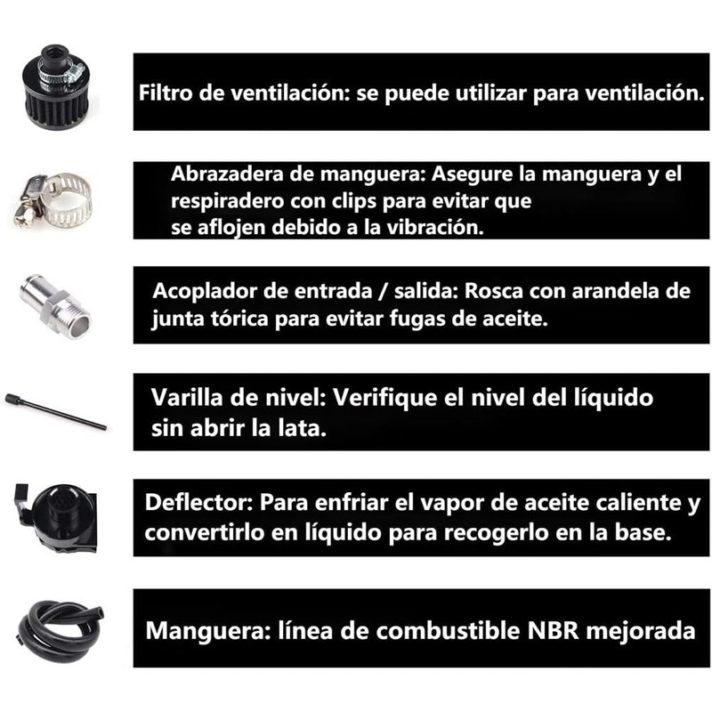 • 【Características】La función del depósito de aceite es absorber el vapor de aceite y convertirlo en aceite, mantener el motor limpio y prolongar la vida útil del motor. La varilla de nivel integrada se utiliza para comprobar el nivel de líquido. Cuando esté lleno de aceite, debes vaciarlo y volver a instalarlo.