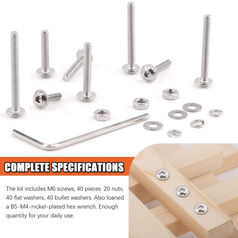 • 🔨[Package Includes] You'll get 40pcs M6-1 button head bolts, 20pcs M6 hex nuts, 40pcs M6 flat washers, 40pcs M6 lock washers, 1pc M4 Allen wrench, total of 141pcs, which can meet your needs of daily use.