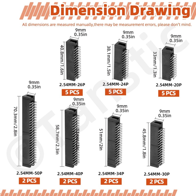 - What You Will Get: You will get 23pcs 2.54mm box header, including 5pcs 20 pin, 5pcs 24 pin, 5pcs 26 pin, 2pcs 30 pin, 2pcs 34 pin, 2pcs 40 pin, 2pcs 50 pin.