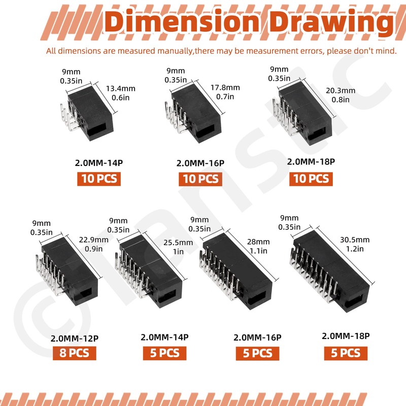 • What You Will Get: You will get 50pcs 2.54mm box header, including 10pcs 6 pin, 10pcs 8 pin, 10pcs 10 pin, 5pcs 12 pin, 5pcs 14 pin, 5pcs 16 pin, 5pcs 18 pin.