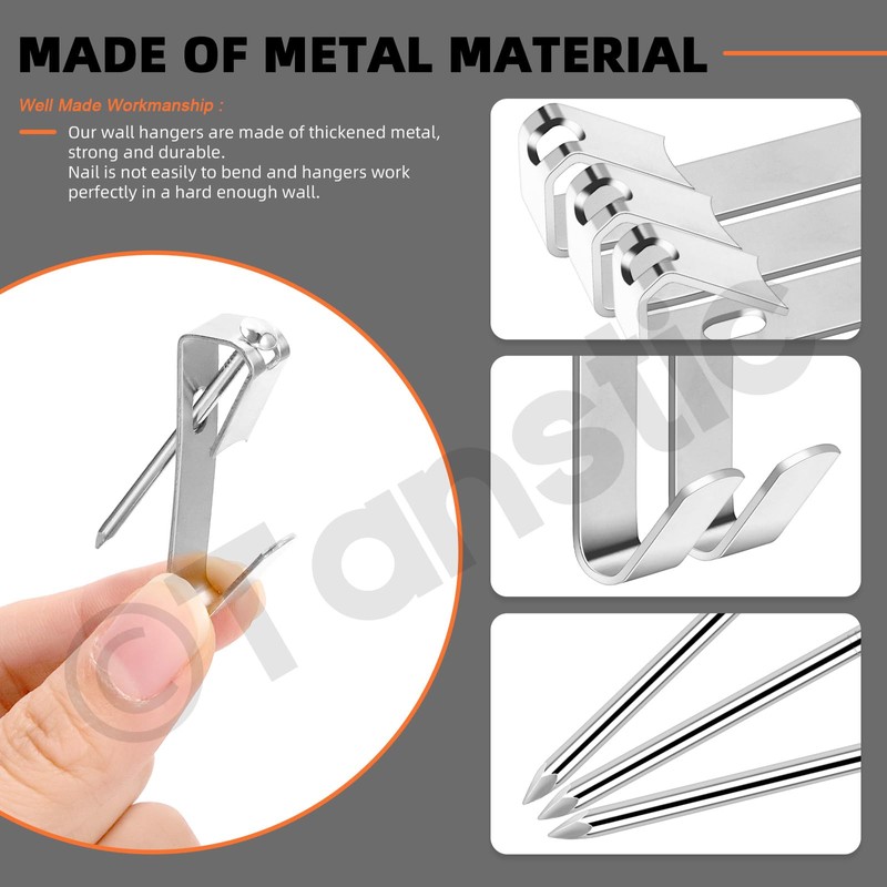 • Reliable material: picture hangers and nails are made of metal, sturdy and durable, not easy to bend or break, with good bearing capacity and strong fixation effect, and can be used for a long time.