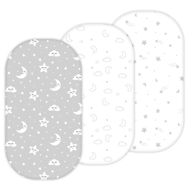 TansyPanda Bassinet Sheets for Munchkin Brica Pod, 4moms MamaRoo, Nordmiex, Beberoad Travel Bassinet, 3PC, 18 x 30 Inch, Ultra Soft, Breathable, Snug Fit, Unisex Boys and Girls (Moon, Stars, Clouds)