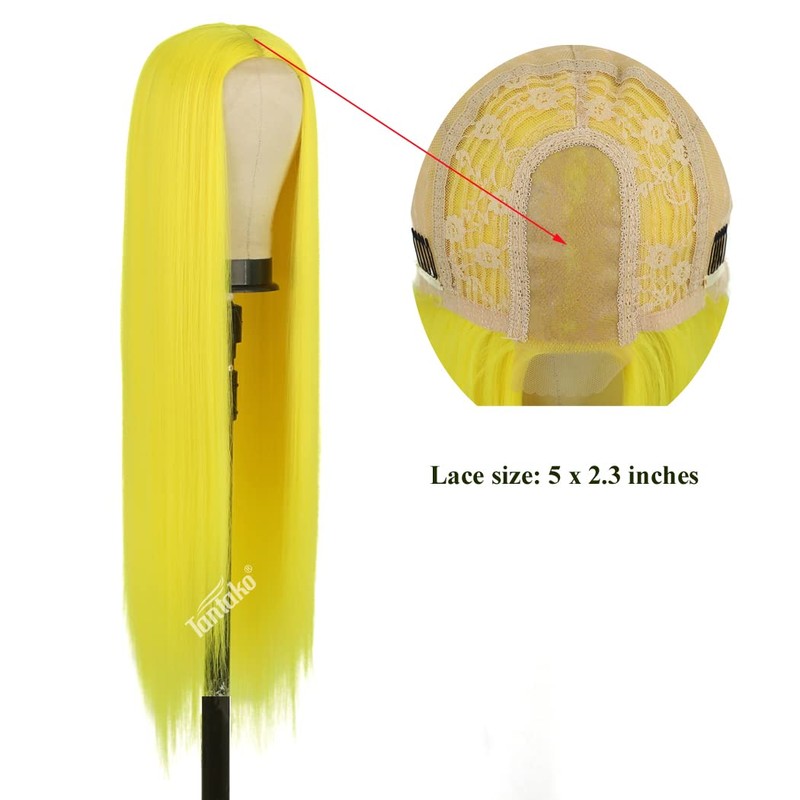 - This long yellow synthetic wig is a lace front wig, but not the full lace wig, it only has a small piece of lace on the middle parts to make the hairline close to nature. The lace size should be 5 x 2.3 inches.