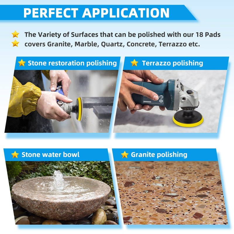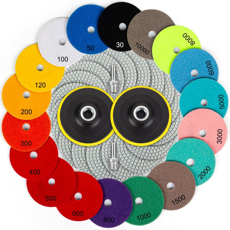 18 Pack 4 inch Diamond Polishing Pads Set Wet/Dry Polishing Kit 18pcs 30#-10000# Grit Pads with 2pcs Hook and Loop Backer Pads for Granite Stone Concrete Marble Floor Grinder or Polisher