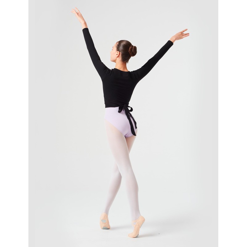 The wrap jacket made of soft and firm cotton blend is ideal for wearing during the warm-up phase in ballet class, on cooler days or simply during the training break. In combination with a short-sleeved or strappy jersey or dress, it rounds off the ballerina outfit perfectly. So the ballerina can wear your favourite dresses at any time of year.