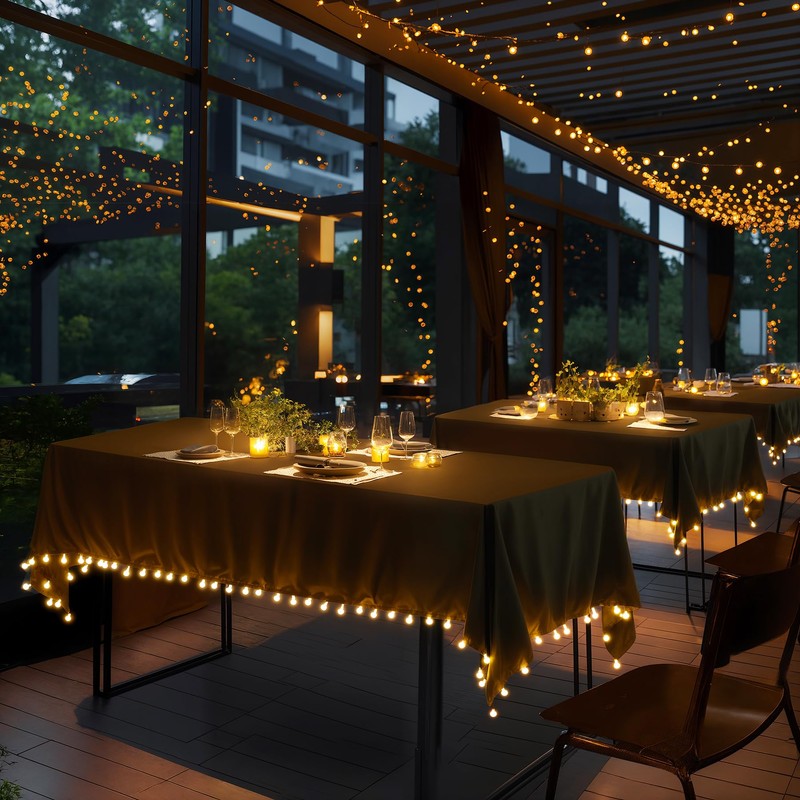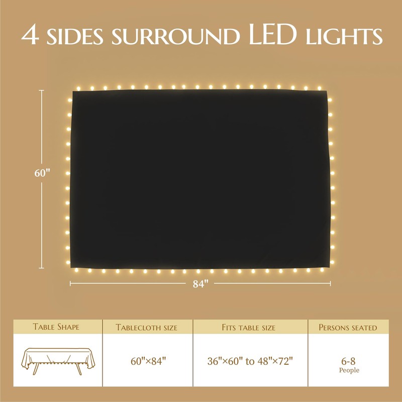 - Light Up- The black tablecloth features lights string that create a warm and cozy atmosphere, perfect for adding a touch of charm to any dining experience. The soft glow of the lights enhances the ambiance and creates a welcoming environment for gatherings and special occasions.