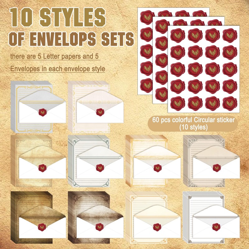TaoBary 160 Packs Stationery Paper Set (50 Double Sided Stationery Writing Papers 50 Matching Envelopes) 60 Round Dot Sticker, 10 Design(Retro,8.5 x 11 Inch)