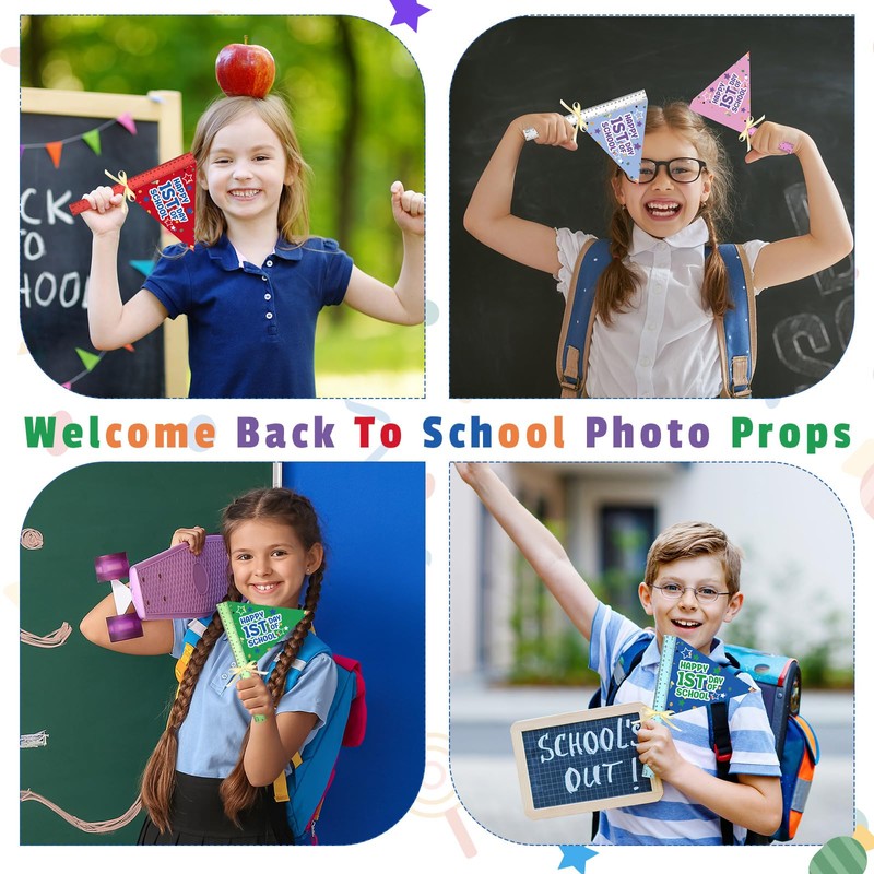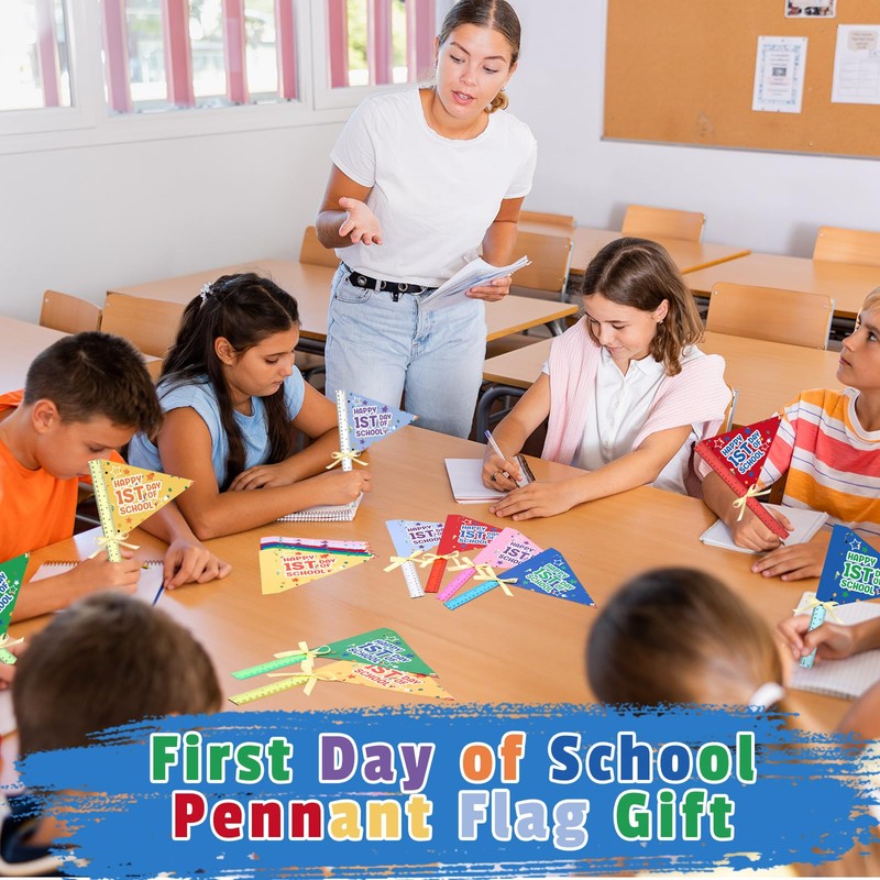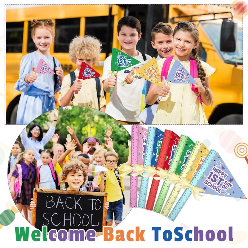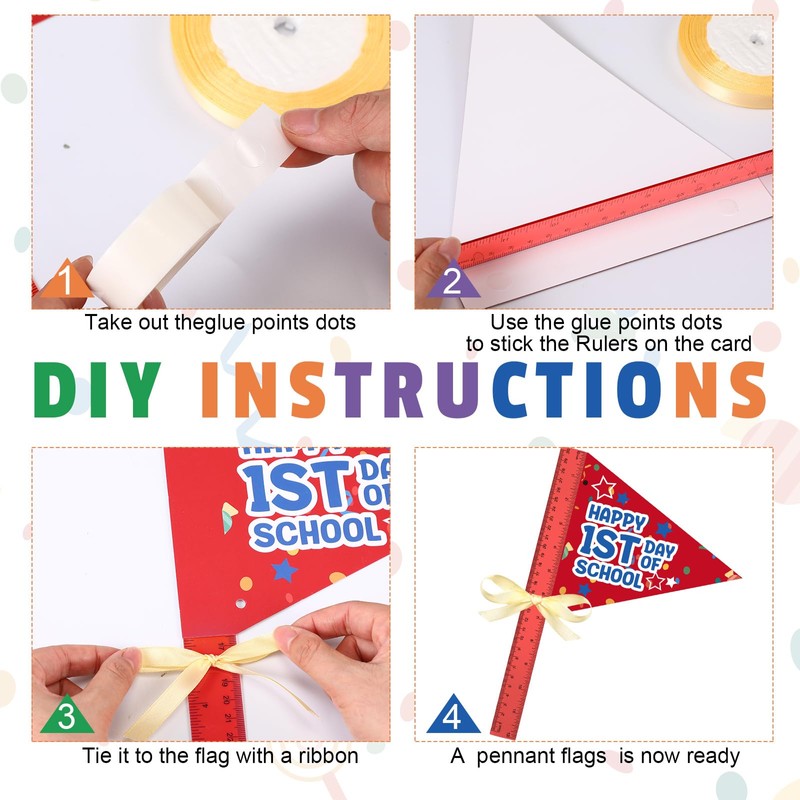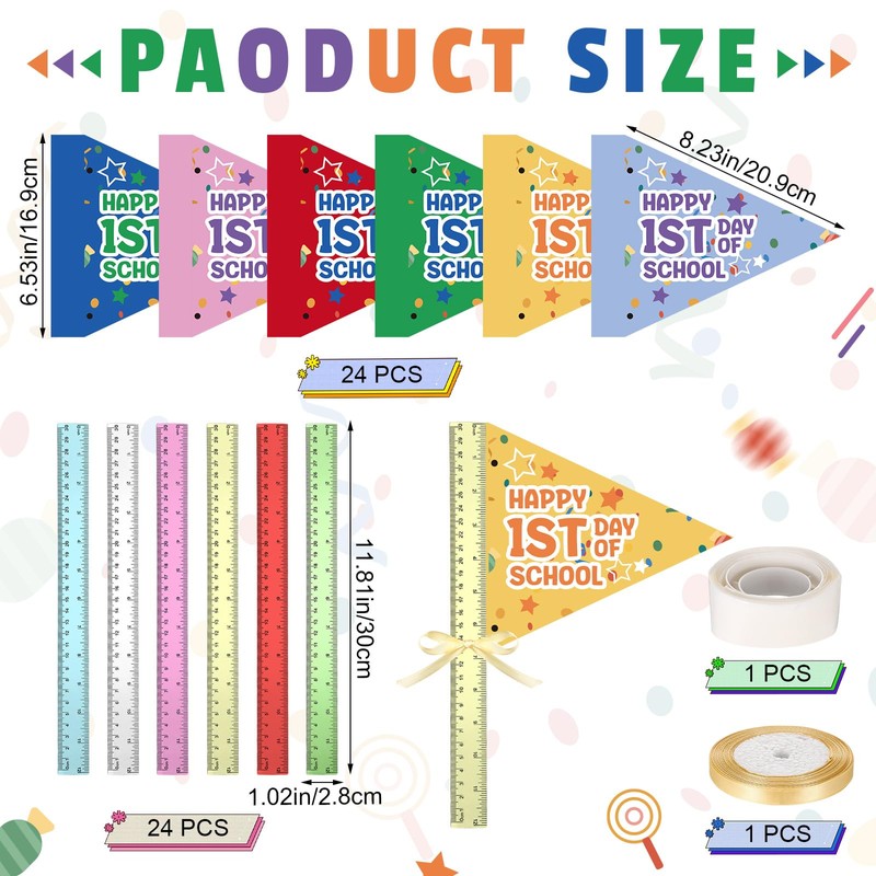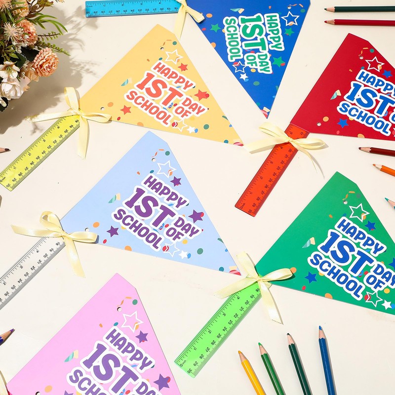 - Welcome Back to School Pennant Set: the package contains 24 cards (6 styles, 4 cards each), 24 rulers (6 colors, 4 rulers each), 1 roll of champagne yellow ribbon and 1 roll of glue, which are sufficient to meet your personalized decoration needs; The cards are printed with the words "HAPPY 1ST DAY OF SCHOOL", with stars and dots, creating a cheerful atmosphere for the classroom, and are the ideal decoration for the first day of school