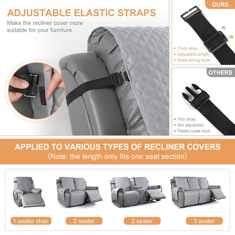 - Adjustable length- All straps are adjustable. Works with most types of recliner chair cover, loveseat recliner cover, 3 seater recliner sofa cover.