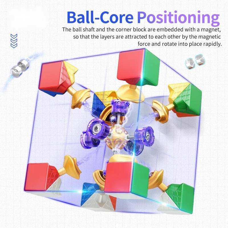 - Ball-Core Positioning-The ball shaft and the corner block are embedded with a magnet , so that the layers are attracted to each other by the magnetic force and rotate into place rapidly .