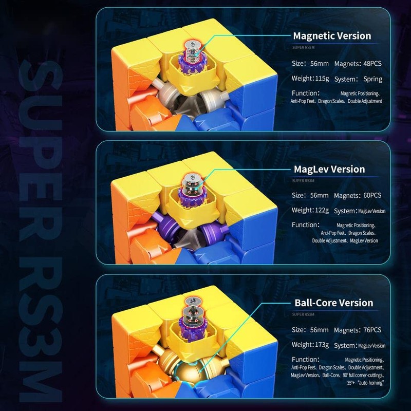 - The MoYu Super RS3M 2022 Maglev Ball-Core version 2022 3x3 (MagLev Ball-Core) is the ultimate version of the upgrade, the maglev elastic system with the axial magnetic system, let you Max your hand speed, This is definitely the cheapest axis magnetic force with magLEV flagship cube, its quality has reached the flagship level, can be used as the most new main force.