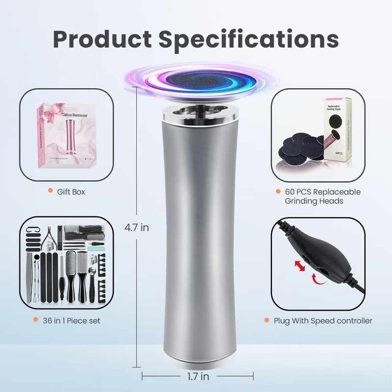 - 36-in-1 Manual Pedicure Tools for FeetThis Electric Foot Callus Remover comes with a 36-in-1 manual pedicure kit, allowing you to combine the power of both electric and manual tools for a more effective, thorough foot care routine. The electric tool easily removes dead skin and calluses, while the manual set provides precision for smaller areas, ensuring your feet look and feel their best with an enhanced level of care