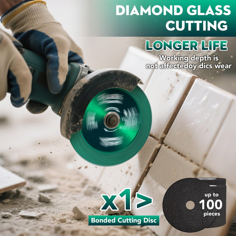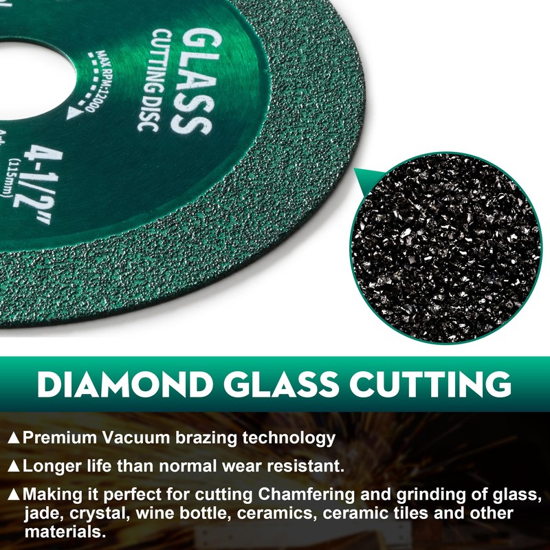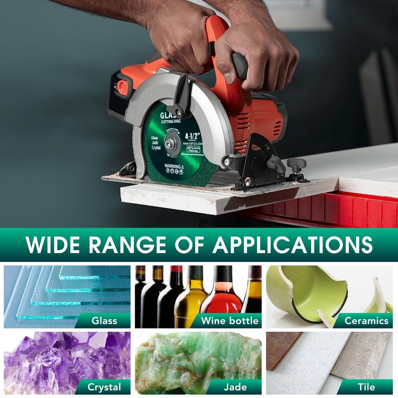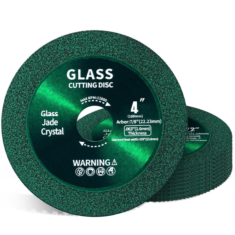 - Versatile Compatibility: Comes with 10 pcs green glass cutting disc. Our glass cutting blade is compatible with 4inch (Model 100/115) angle grinders, with a diameter of 4''mm (100mm), an inner hole of 0.87'' (22mm) , and a thickness of 0.04" (1mm). Very suitable for smooth cutting, beveling and grinding of glass, jade, crystal, wine bottles, ceramics, tiles and other materials