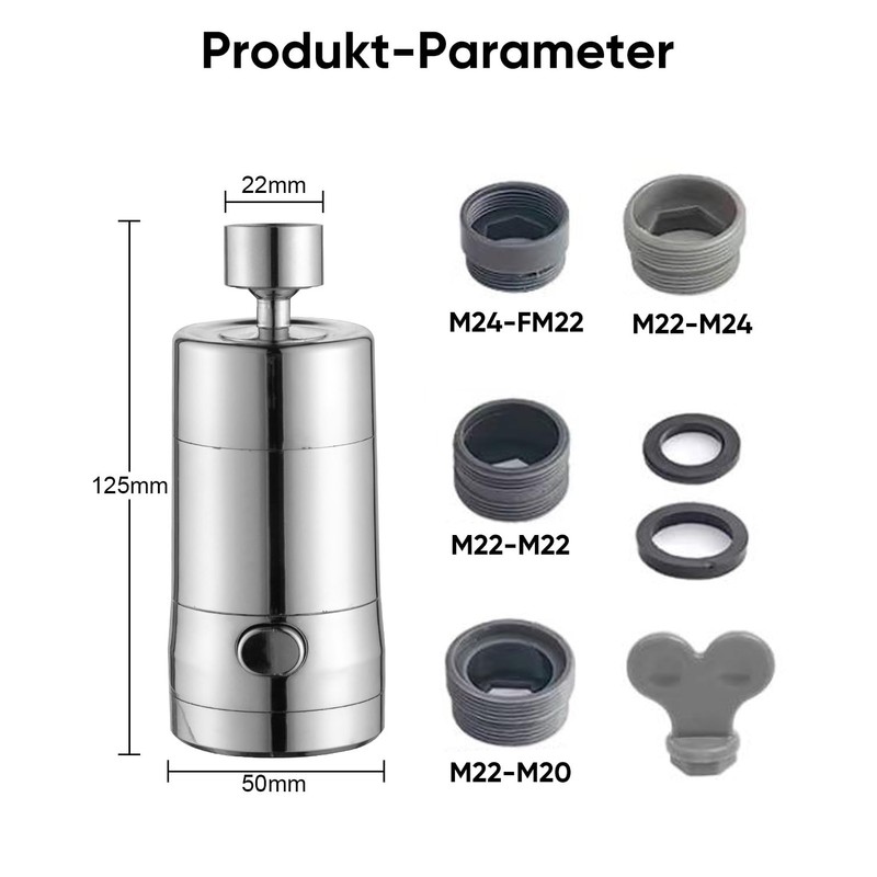 - Package Content The carton includes 1 faucet head, 4 adapters (M24-FM22, M22-M22, M22-M24, M22-M20), 2 black washers, 1 waterproof tape and 1 mini thread wrench