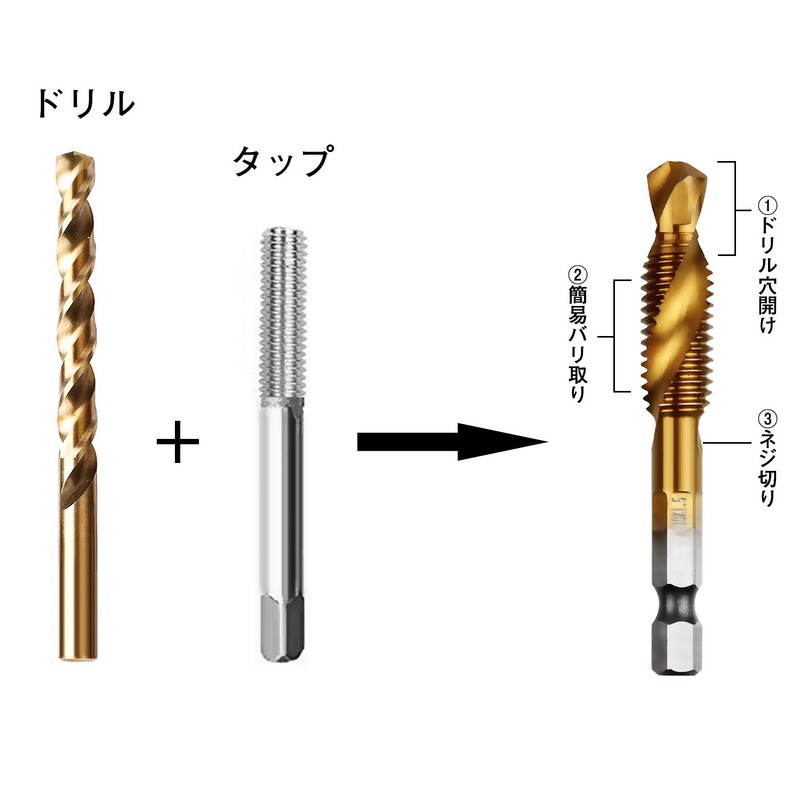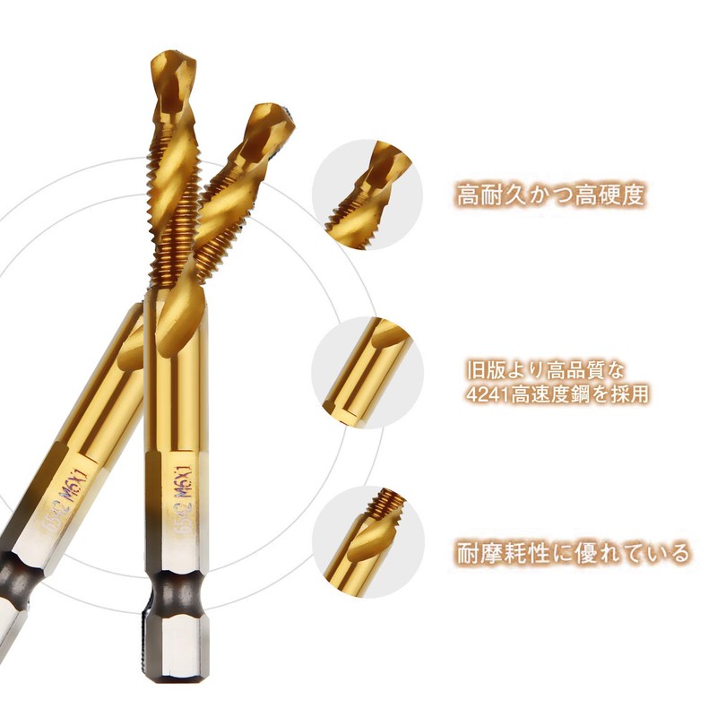 - (Durable and High Hardness) By adopting HSS high-speed steel, it is more toughness than carbide alloys and can be cut faster. It has excellent abrasion resistance, heat resistance, and sharpness, and the titanium coated tap drill has high rust resistance