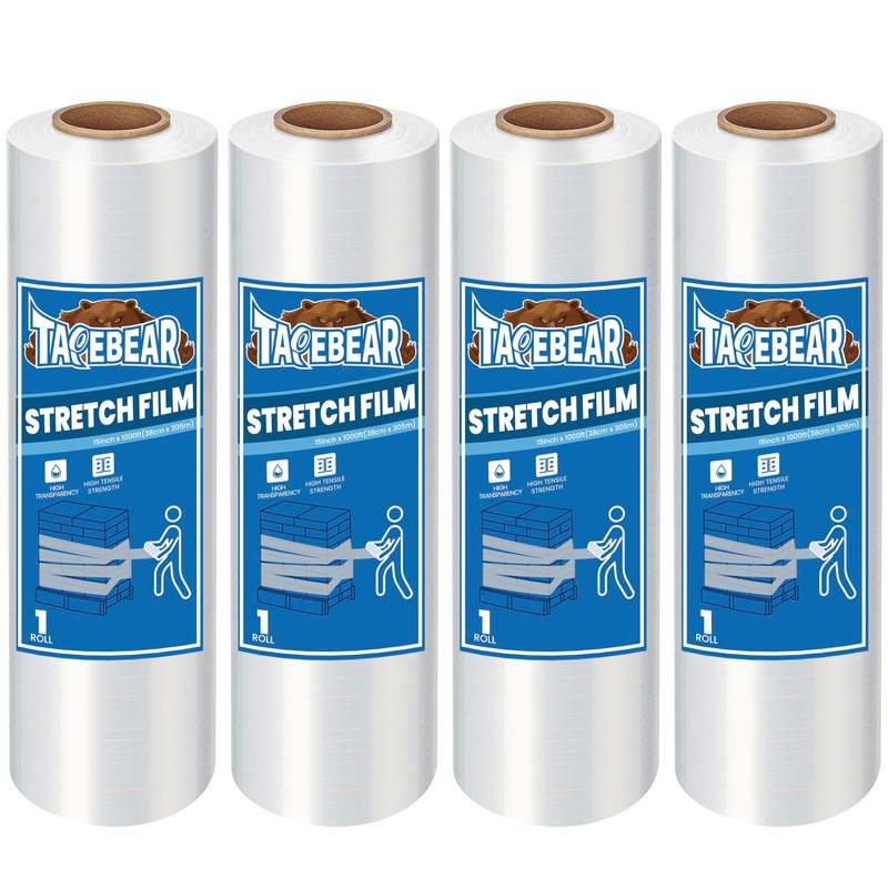 TAPEBEAR 4 Rolls Stretch Wrap Heavy Duty 15" x 1000 Ft, 80 Gauge Industrial Strength Shrink Wrap, High Performance Clear Plastic Wrap Self-Adhering for Furniture Moving, Luggage Packing, Pallet Wrap