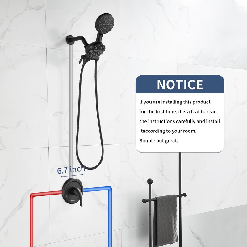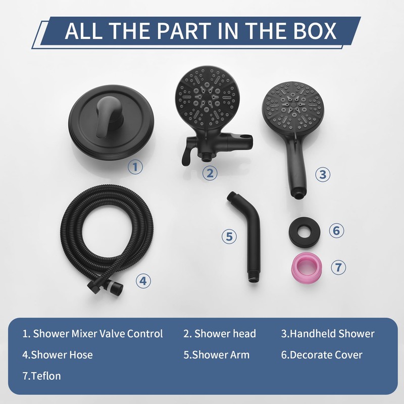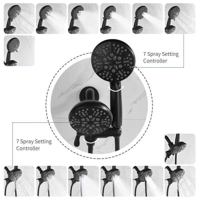 - 🥇【Matte Black Shower Fixtures】Simple and stylish black shower faucet set complete designed with 7-setting overhead shower head and handheld shower, which can be used separately or simultaneously.
