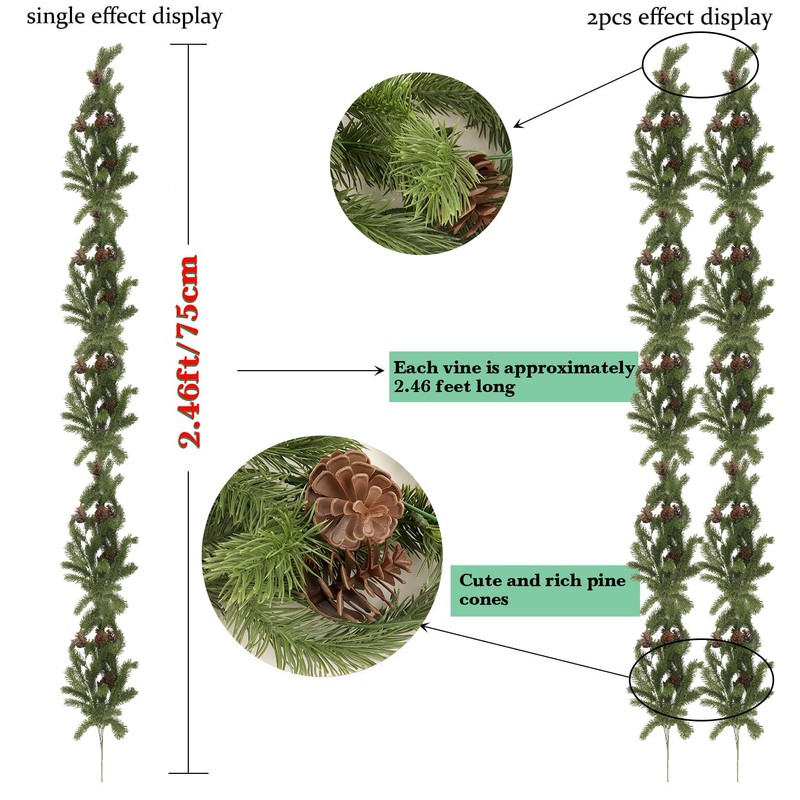 - The size of a Christmas artificial vine, this Taque artificial vine is 30 inches long and has rich green leaves and pine cones on top (details shown in the picture). Very suitable for home, vacation, and DIY decoration. The packaging includes a lifelike Christmas vine with pine cones and green leaves on top.