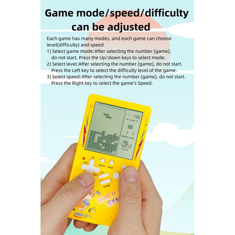 - Modes / difficulty / speed can be selected. Each game has many modes and each game can choose level (difficulty) and speed 1) Select game mode: after selecting the number (game), do not start. Press the up/down buttons to select the mode. 2) Select level: Do not start after selecting the number (game). Press the left button to select the difficulty level of the game. 3) Select speed: Do not start after selecting the number (game). Press the right button to select the speed of the game.