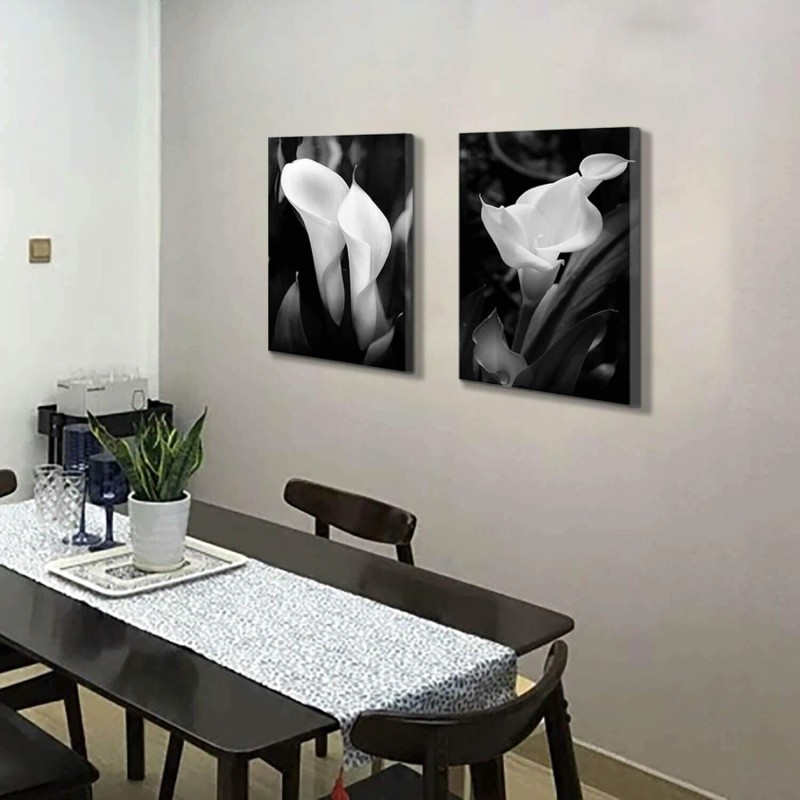 - Black & White Contrast Lily Canvas Wall Art: Gorgeous black and white flower canvas artwork featuring eight beautiful calla lilies against a contrasting gray background ( Multiple sizes available )