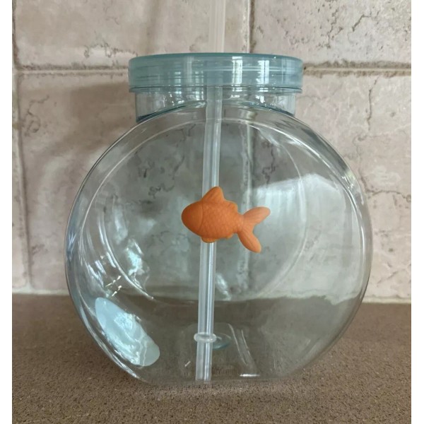 Fish bowl tumbler cup - clear turquoise blue plastic- with orange fish accessory on a plastic straw. Fishbowl cup is food and drink safe.