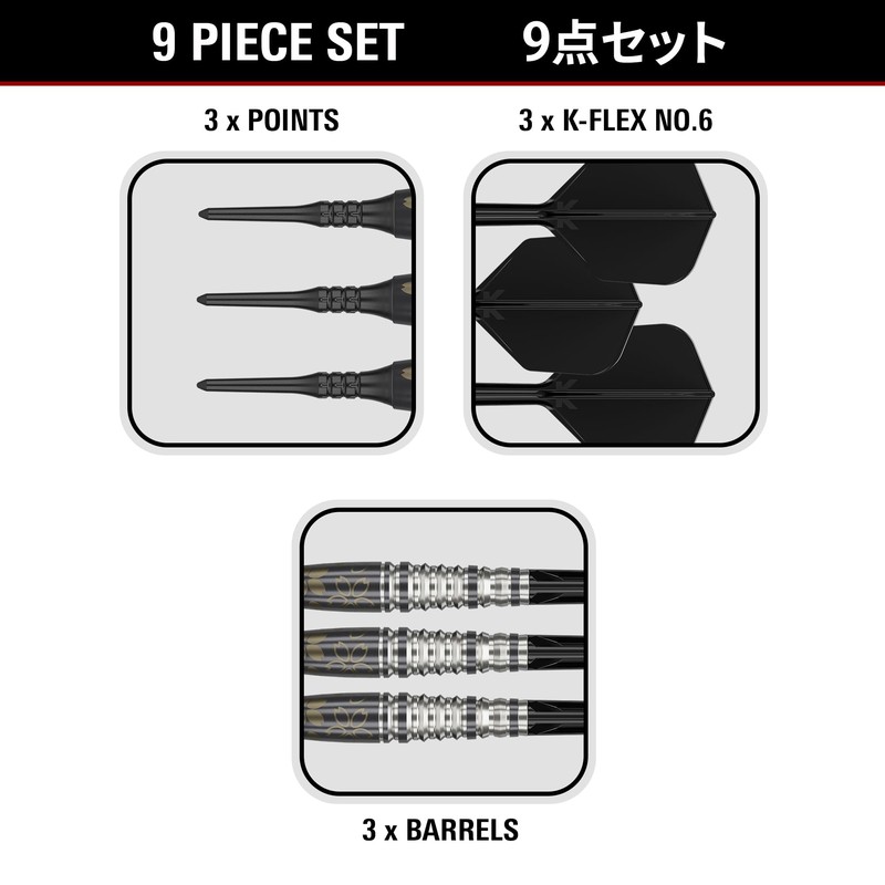 - Set Includes: 3 x 90% tungsten barrels, 3 x black pixel tips (25mm) and 3 x No.6 (shape) K-Flex flights (26mm)