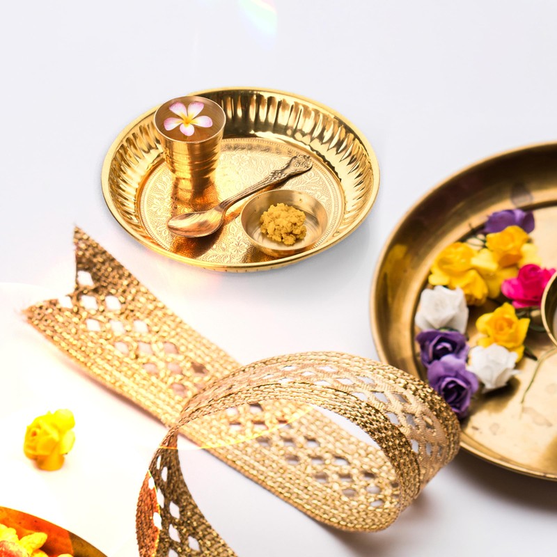 - Brass Bhog Thali Set is made from high quality brass material and finishing and detailing work that boasts a level of purity and ensures its longevity, making it a timeless addition to your home. Its radiant glow and smooth texture add a touch of opulence to your sacred space.