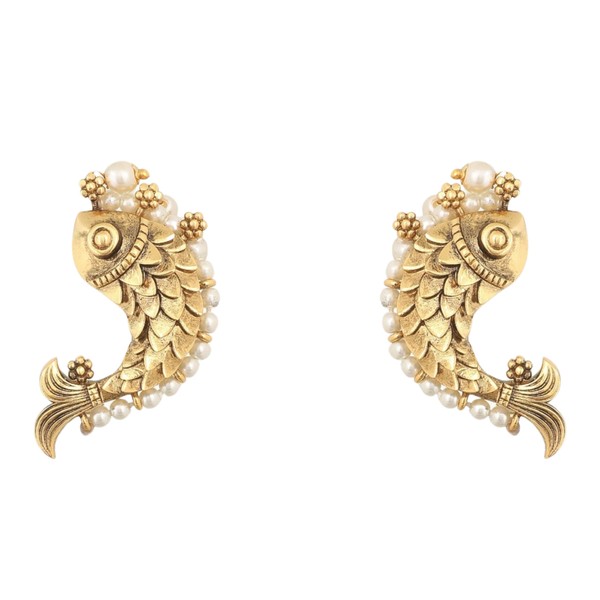 Tarinika Fish and Pearl Oxidized Classic Earrings(Gold-Plated Brass) - Indian Earrings for Women | Perfect for Ethnic Occasions | Traditional South Indian Jewelry | 1 Year Warranty*