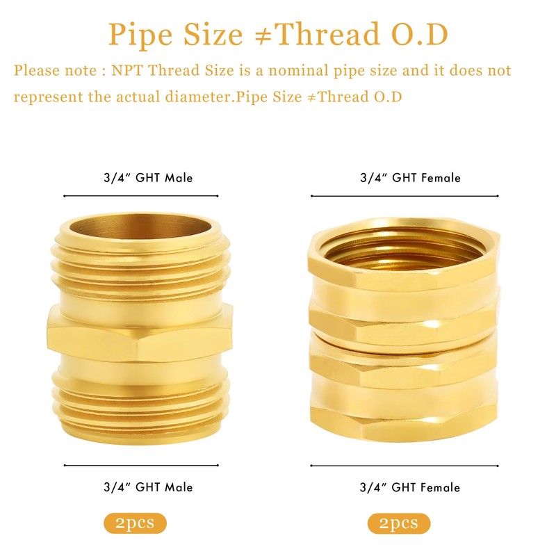 2.As the simple but high-quality connectors, they provide you the ability to attach a garden hose or outlet with 3/4" GHT thread to a pipe with 3/4" GHT thread with ease.