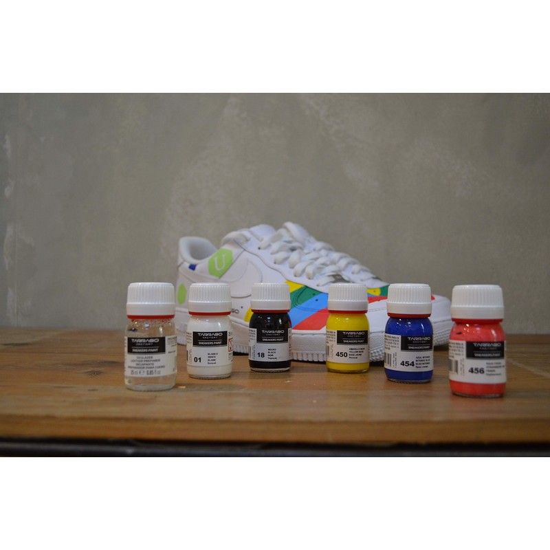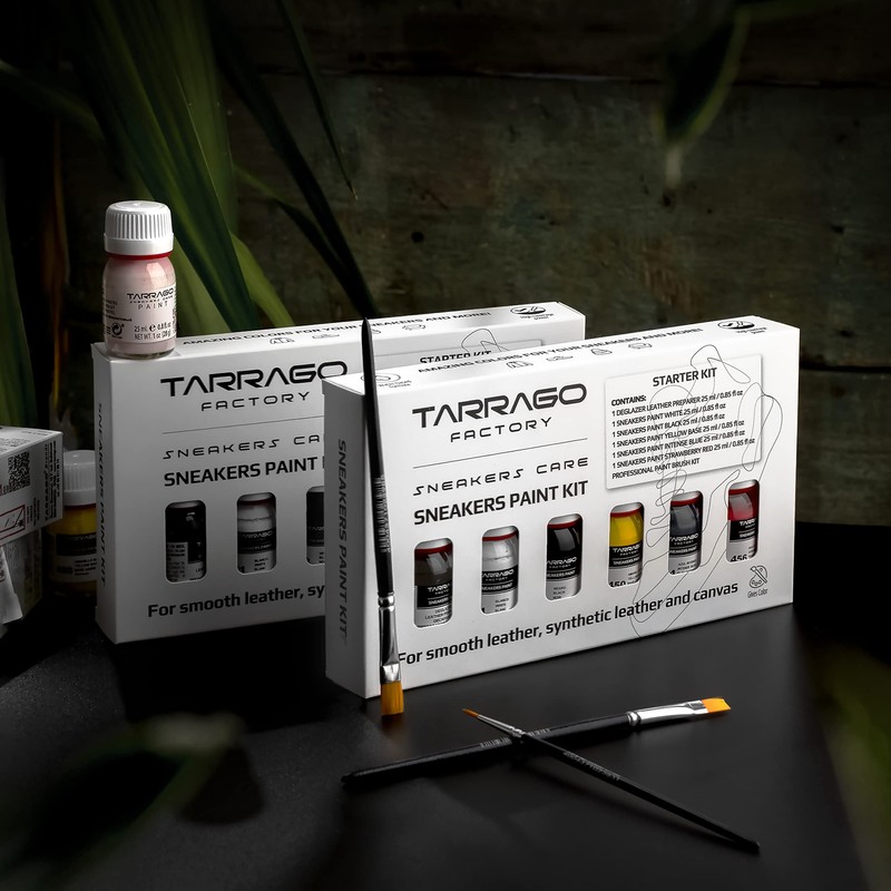 - PACKAGE INCLUDES 1 x White Sneaker Paint 25ml, 1 x Black Sneaker Lacquer (25ml), 1 x Sneaker Lacquer (25ml), 1 x Sneaker Paint Strawberry Red 25ml, 1 x Tarrago Deglazer Leather Preparer 25ml and 5 Professional Paint Brushes: 3 Flat + 2 Round Brushes
