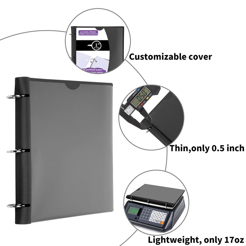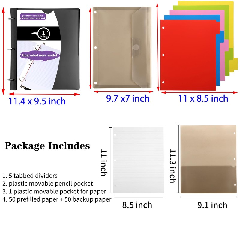 - This notebook with dividers and pockets comes prefilled with 50 pieces of 8.5"x 11" college ruled paper, 50 backup papers, 5 colored tabbed dividers,1 semi-transparent divider with 3 pockets, and 1 movable pencil pocket. This 3 ring notebook dimensions are 11.4" x 9.5". Normally, in back-to-school season, you need to buy 5 subject notebooks and 1 binder, but now, with this all-in-one notebook, you only need to bring one, which can greatly save your backpack space.