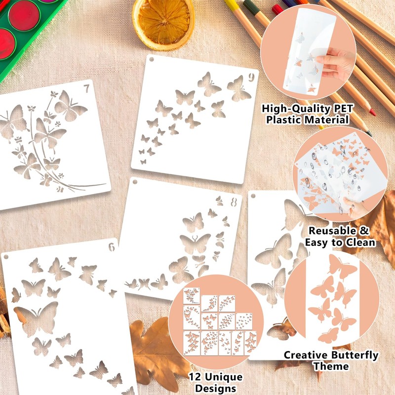 - Creative Butterfly Stencil Set: This set includes 12 different butterfly designs, with a variety of styles. It is perfect for crafts, decorative painting, wall designs, card making, and other DIY projects, bringing the inspiration of natural butterfly elements to your creations.