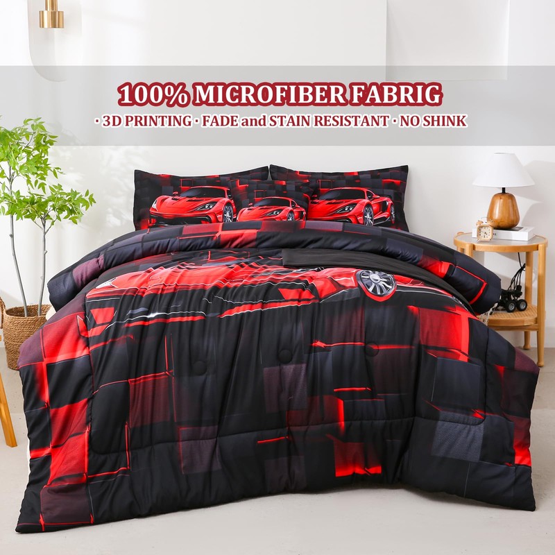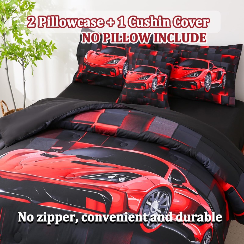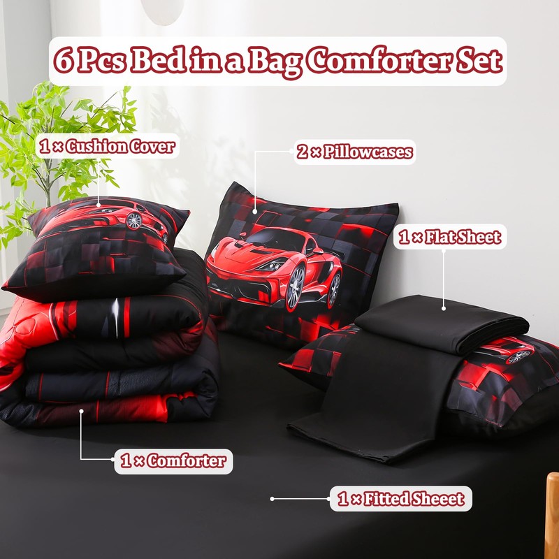 Tasselily 6 Pcs Race Car Twin Bedding Set for Boys,Red Sports Cars Twin Size Comforter Sets with Sheets for Boys Kids Teen