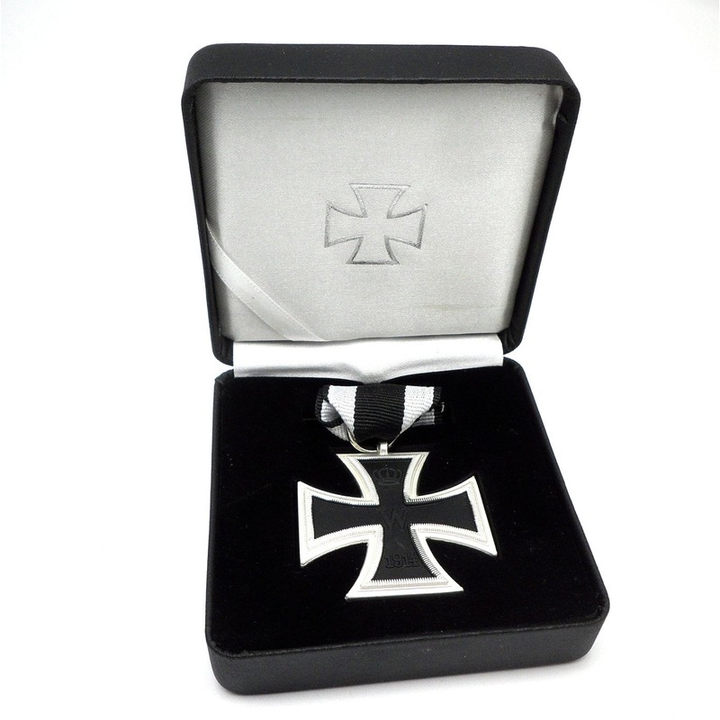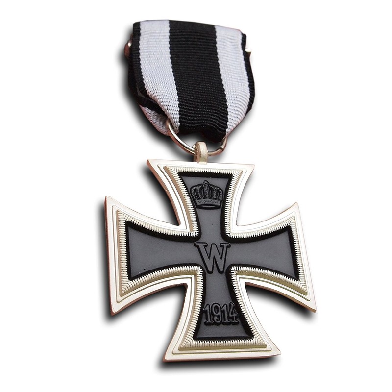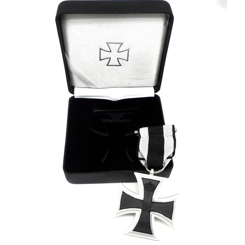 This is an iron cross medal 2. Class 1914 (Repro), based on the version from the 1st World War The high quality metal reproduction is highly detailed and comes with a black and white ribbon and pin. The medal is reversible and can be worn with the W 1914 side outwards or with the FW Oak Leaves 1813.