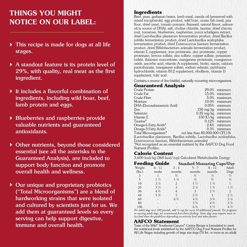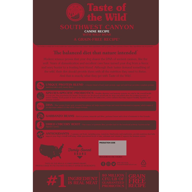 - Taste of the Wild Southwest Canyon with WILD BOAR dry dog food; REAL MEAT is the #1 ingredient; high protein (29%) to help support bones, joints and LEAN, STRONG MUSCLES