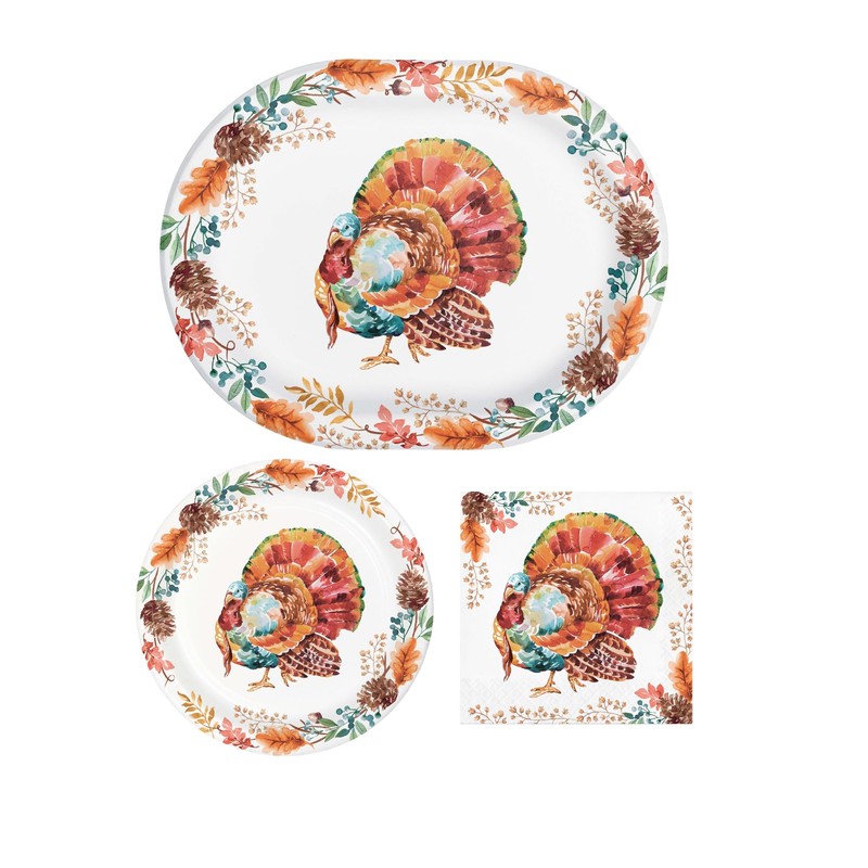 Transform your Thanksgiving celebration with this elegant party supply bundle designed to serve 8 guests in style. The set features a beautiful watercolor turkey design surrounded by a charming fall-themed border with autumn leaves, pinecones, and delicate florals in warm seasonal colors. This comprehensive collection includes 8 large oval banquet plates measuring 12 x 9.25 inches, perfect for those hearty holiday meals, along with 8 coordinating 7-inch appetizer/dessert plates for sides and sweets. The bundle also comes with 16 coordinating 2-ply lunch napkins (6.5 inches when folded) to complete your table setting. The crisp white background makes the artful design pop while complementing any table decor. These disposable pieces make cleanup a breeze without sacrificing sophistication, allowing you to focus on making memories with loved ones. Perfect for both formal Thanksgiving dinners and casual autumn gatherings, this set brings together functionality and festive charm.