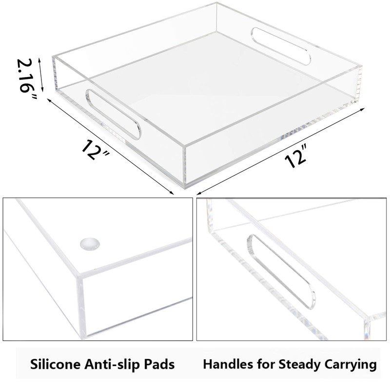 • Clear Acrylic Serving Tray: made of 5mm thick acrylic, the smooth edge design for safer use, sleek and practical; the square shape and clear design give this acrylic tray organizer an elegant look, modern and eye-catching appearance.