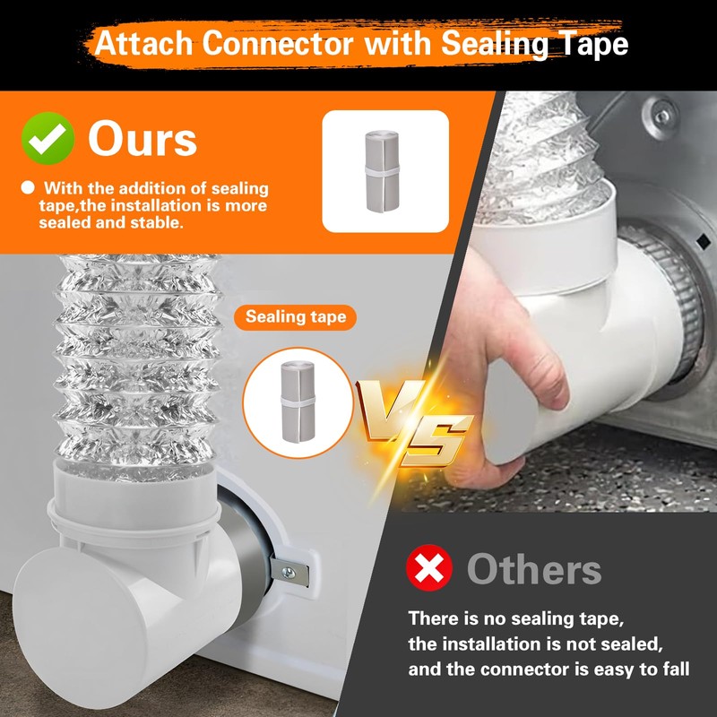 - 【Professional Venting System】Includes 90° adjustable elbow ×2, fire-resistant aluminum hose (10ft), silicone sealing rings ×2, Dryer hose connector turn port *2,sealing tap *2, Compatible with all standard 4" dryer ducts, designed for bathroom vents and laundry room installations