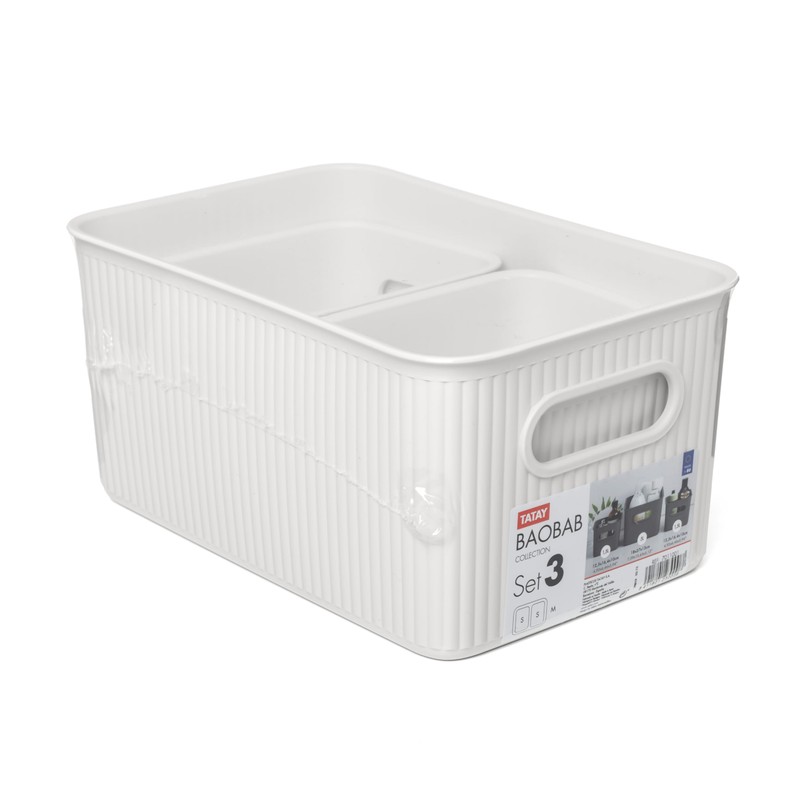 TATAY Set of 3 Rectangular Organiser Boxes Baobab (1 x 5L + 2 x 1,5L), Polypropylene, BPA Free, White. Measures 18,1 x 27,2 x 13 cm