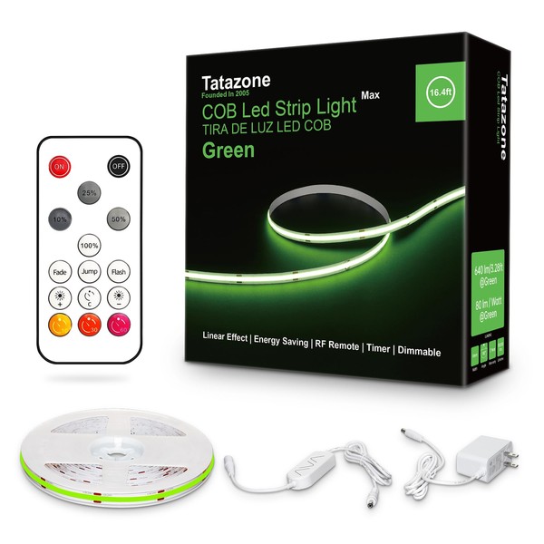 Tatazone 16.4ft Green COB Led Strip Lights with RF Remote, Dotless, Indoor, Dimmable, Adhesive Led COB Light Strip for Cabinet, Room, Bed, Paintings