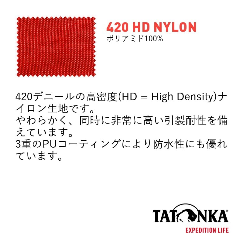 - 【生地の特徴】[420 HD NYLON]420デニールの高密度(HD = High Density)ナイロン生地です。柔らかく、同時に非常に強い引裂耐性を備えています。3重のPUコーティングにより防水性にも優れています。