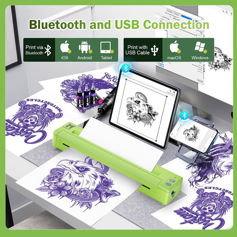 - Easy Operation : The thermal tattoo printer is easy and convenient to operate. With just a few steps, you can quickly print tattoo transfer paper, greatly improving your work efficiency and saving valuable time. Whether you are a professional tattoo artist or a beginner, this temporary tattoo transfer paper printer kit will completely change your tattoo experience, helping you easily create amazing tattoos.