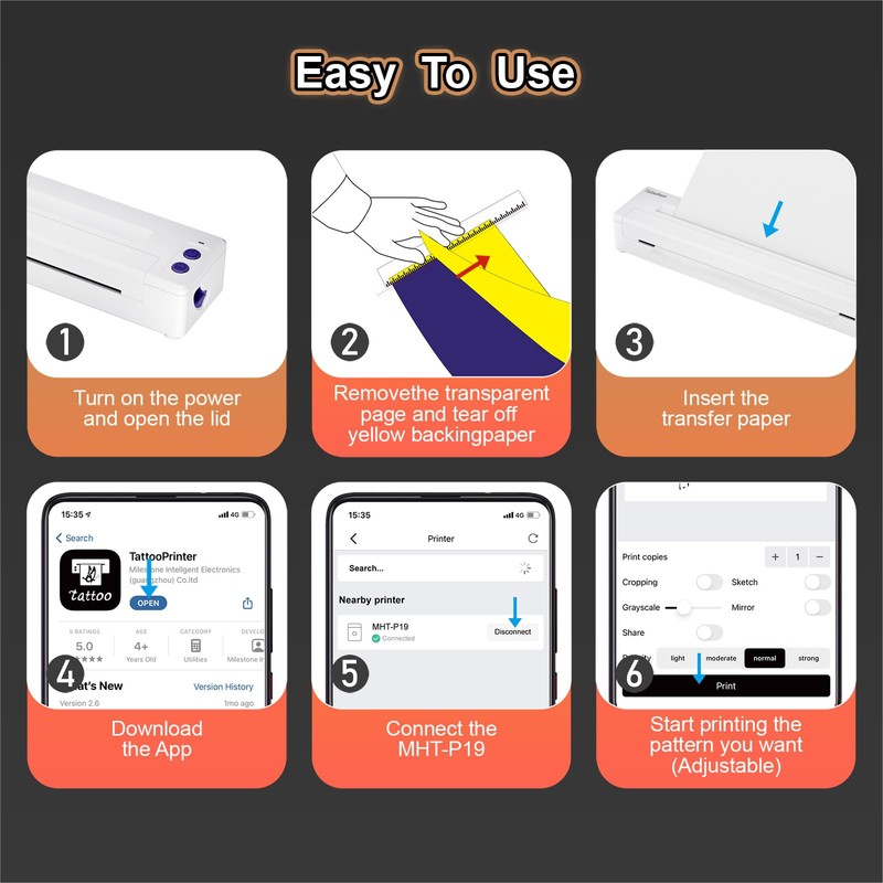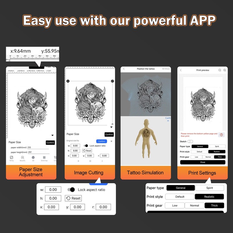 - Easy to Use APP: We have the professional APP to connect and operate the wireless tattoo printer for printing work. Simply upload or select the tattoo pattern, and it can be easily transferred onto the tattoo paper with just one click. You can also create your own tattoo patterns, edit, adjust, simulate tattoo effects, and fully unleash your imagination through the APP.